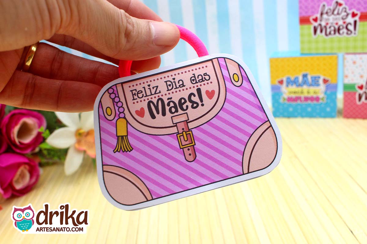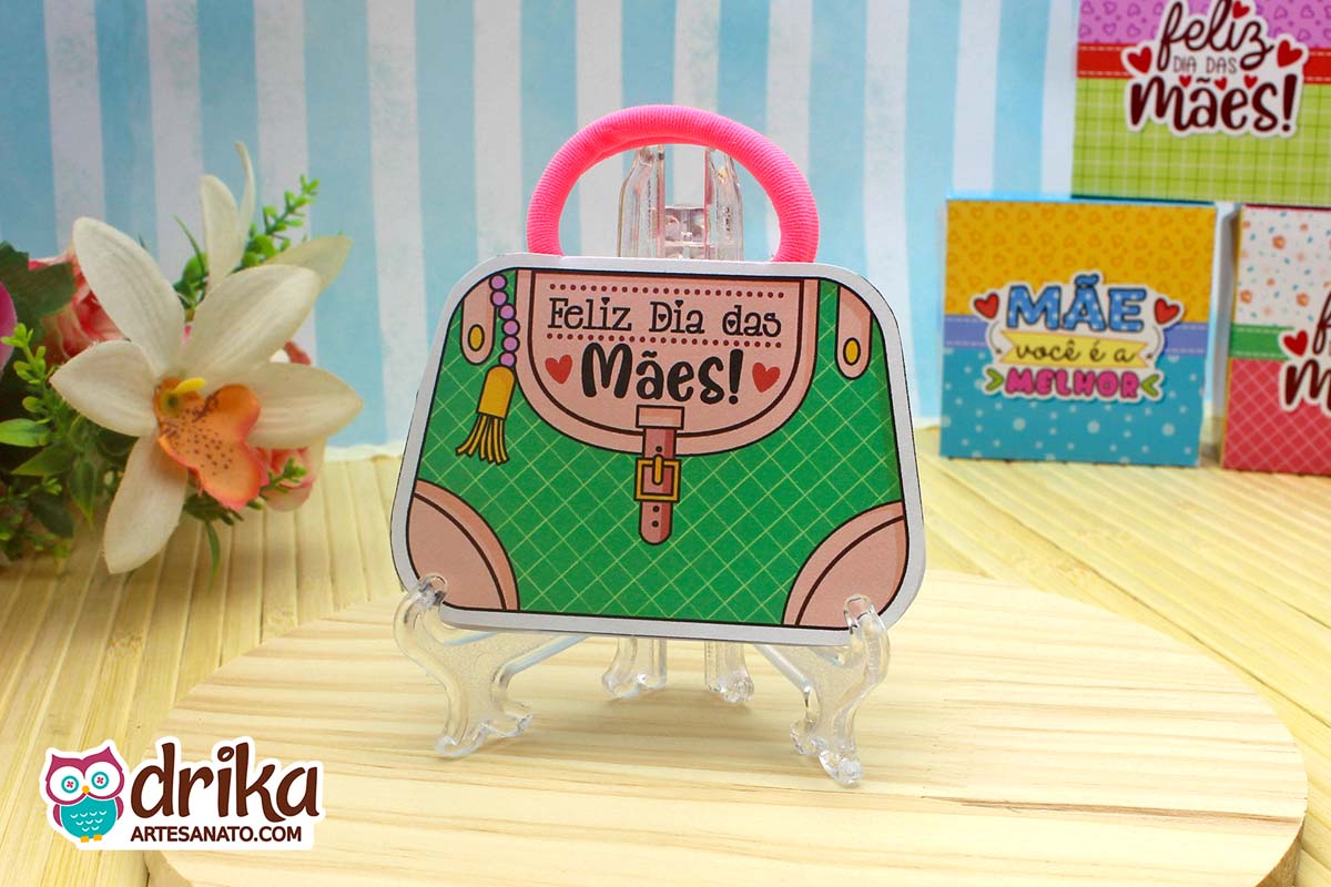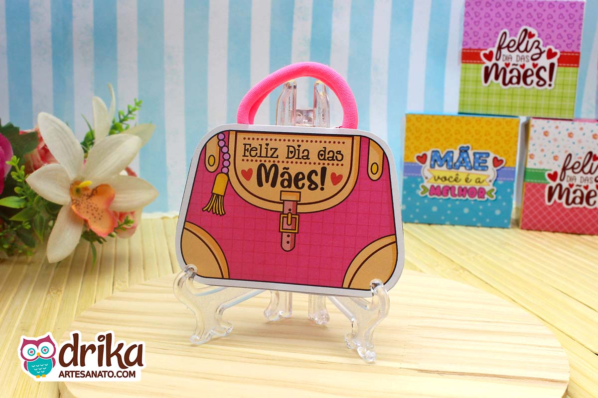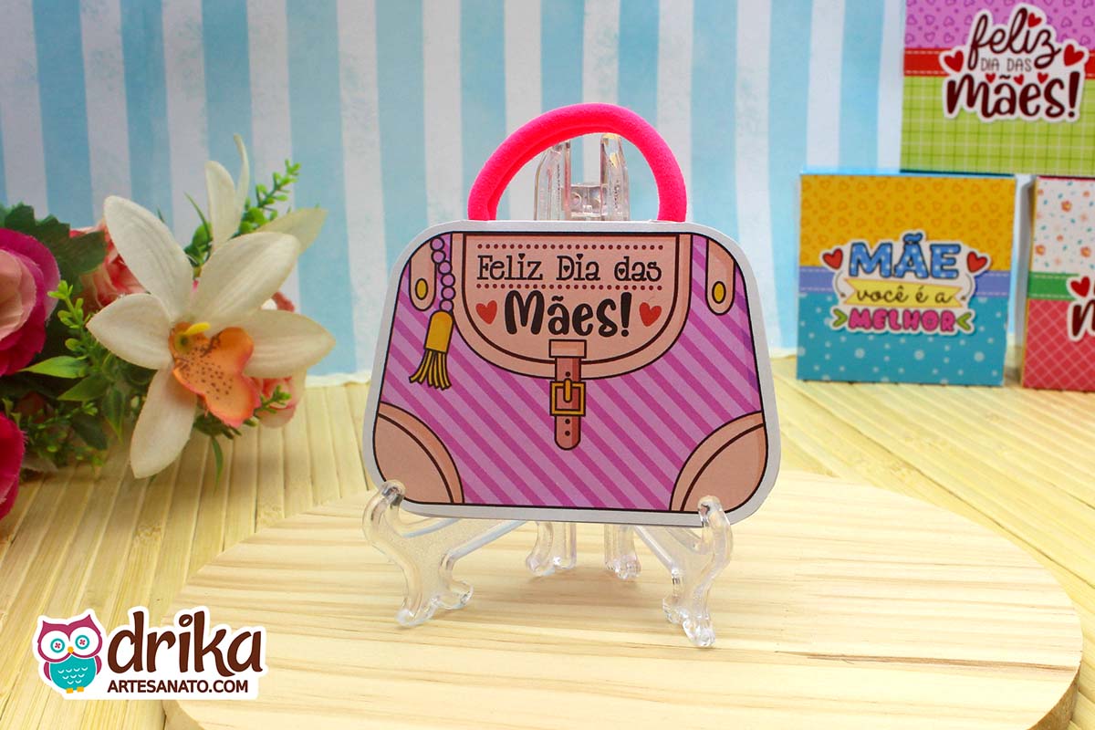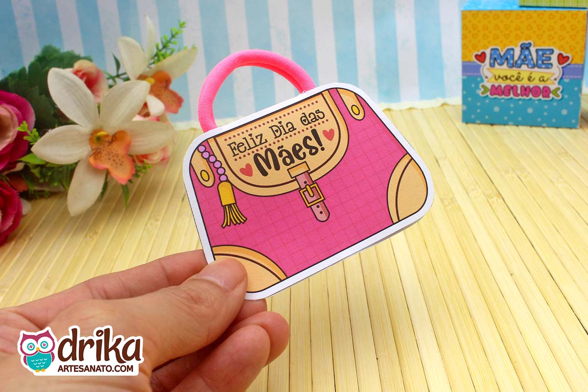 Com detalhes em rosa e a mensagem carinhosa, este modelinho combina perfeitamente com a xuxinha pink que serve de alça, unindo beleza e funcionalidade em um presente pequeno, mas repleto de significado.