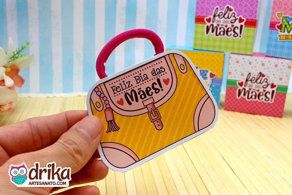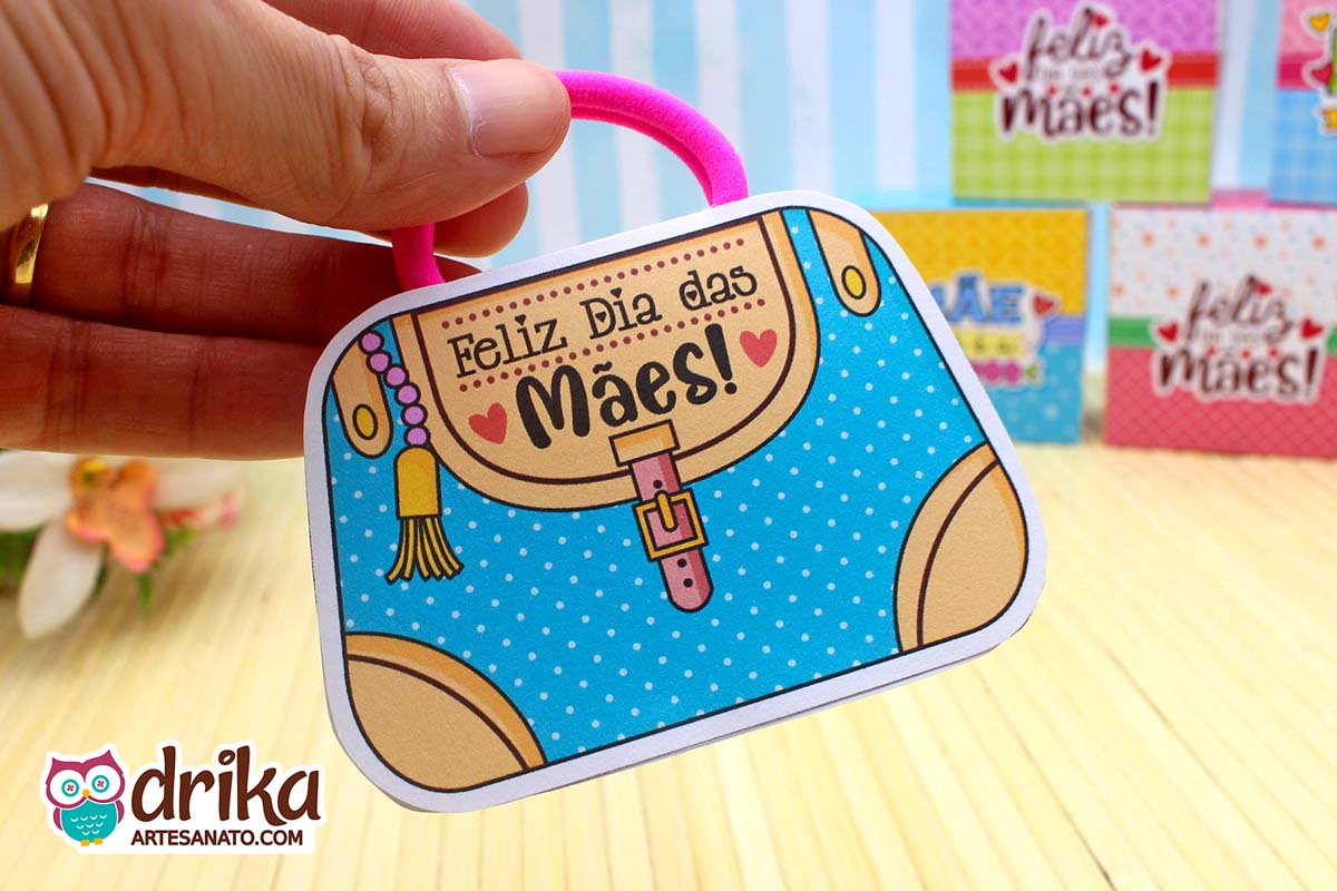 Cada modelinho traz a mensagem “Feliz Dia das Mães” na parte frontal, com detalhes delicados como franjas decorativas e fechos estilizados que dão um toque de realismo à miniatura.