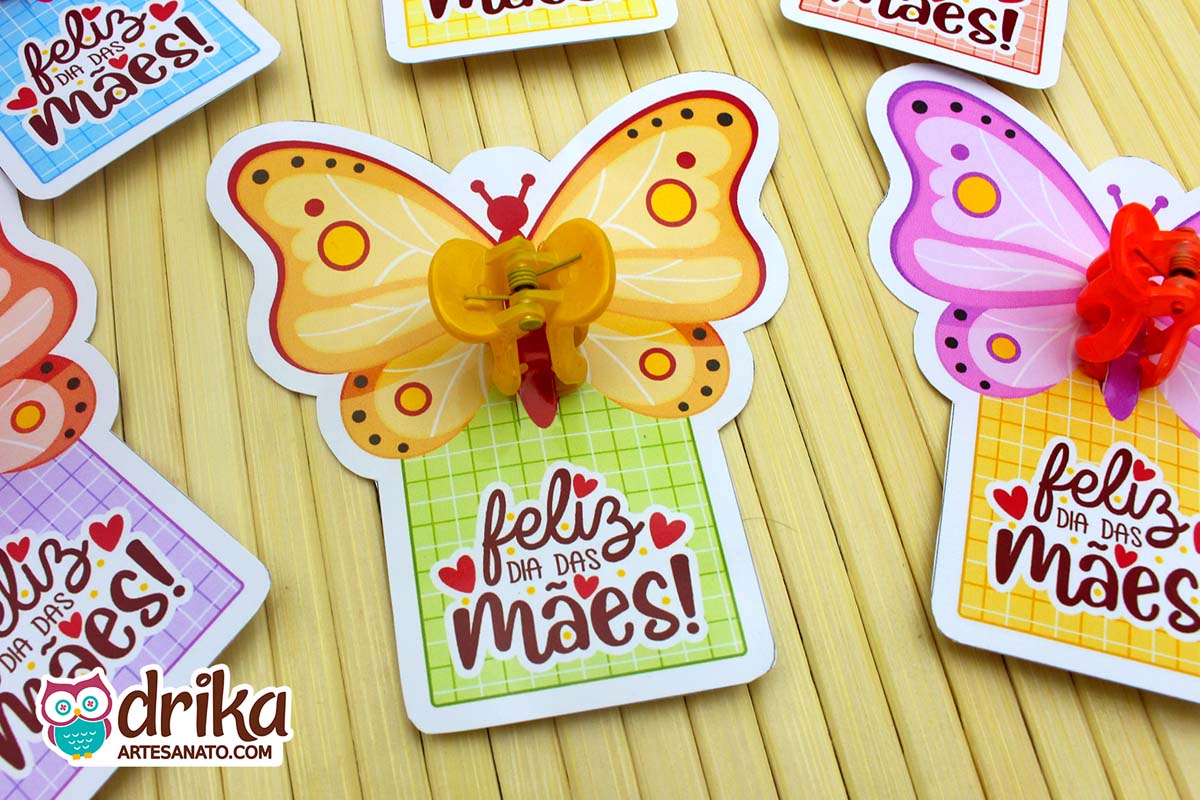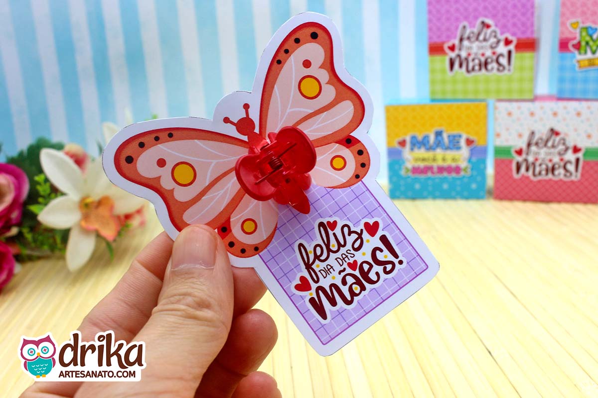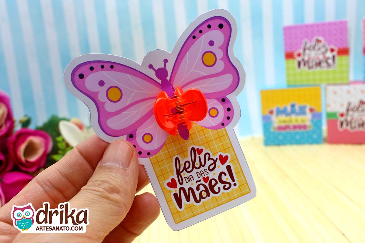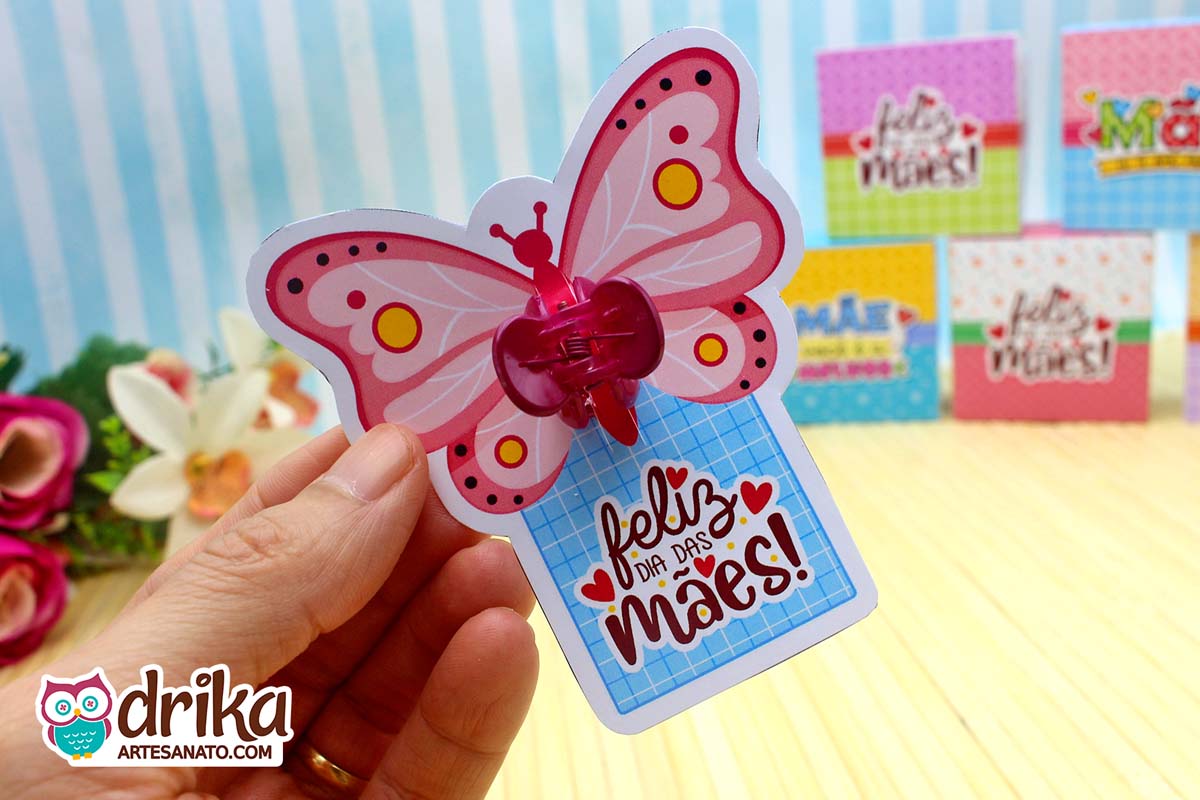 Este Card Mini Piranha de Cabelo com Borboleta tem 6 modelos, sendo apenas uma das opções encantadoras que preparamos para você na nossa Coleção VIP de Lembrancinhas de Dia das Mães!