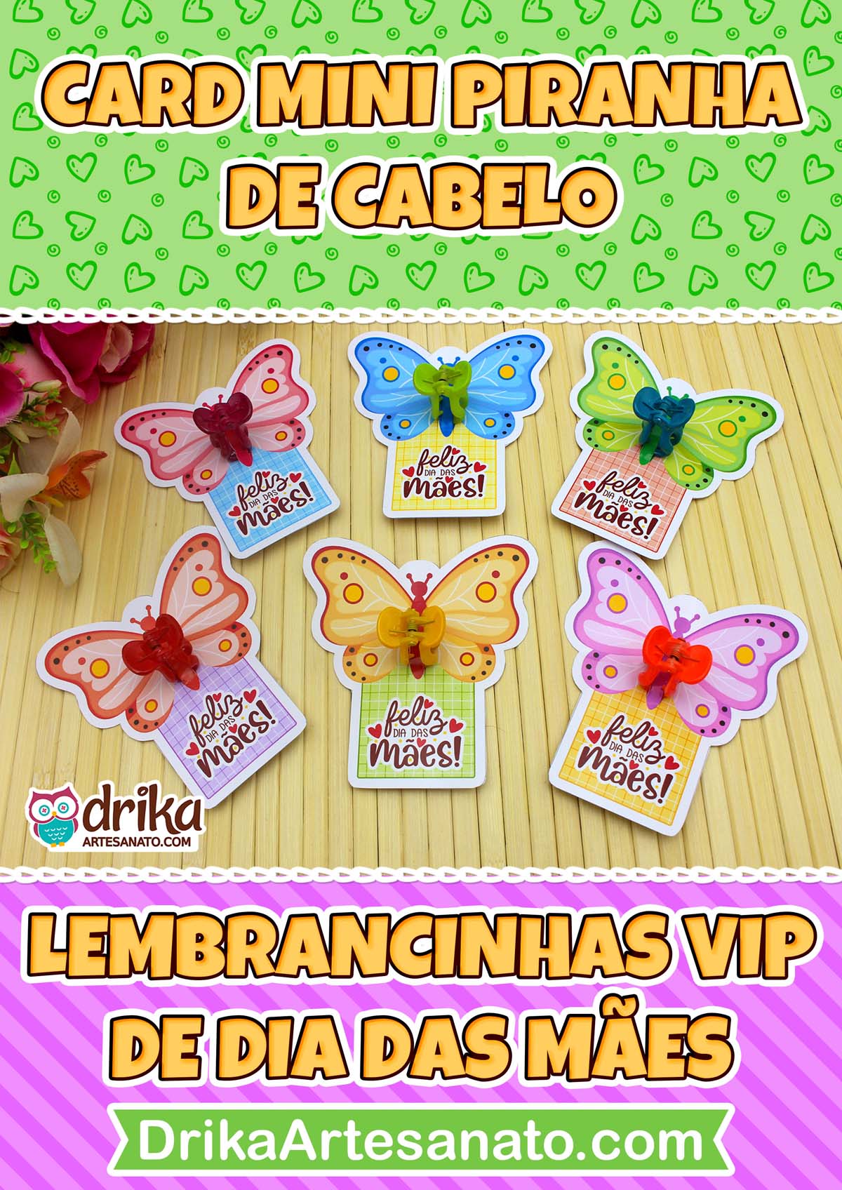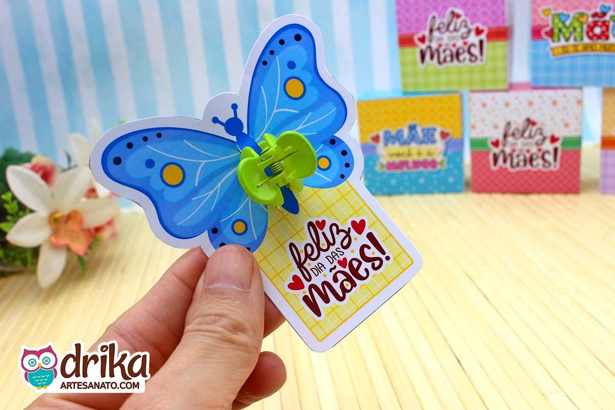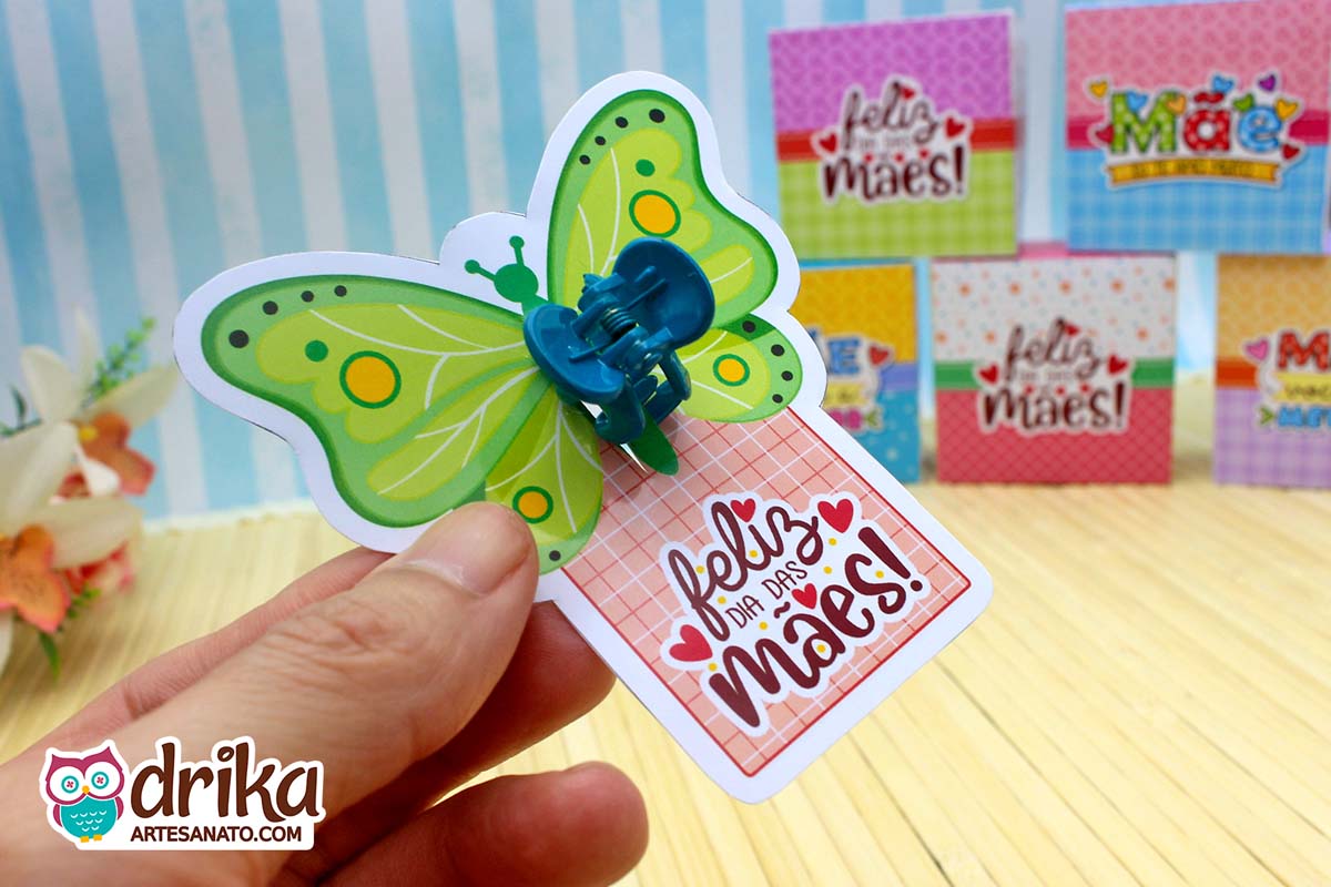 Este Card Mini Piranha de Cabelo com Borboleta tem 6 modelos, sendo apenas uma das opções encantadoras que preparamos para você na nossa Coleção VIP de Lembrancinhas de Dia das Mães!