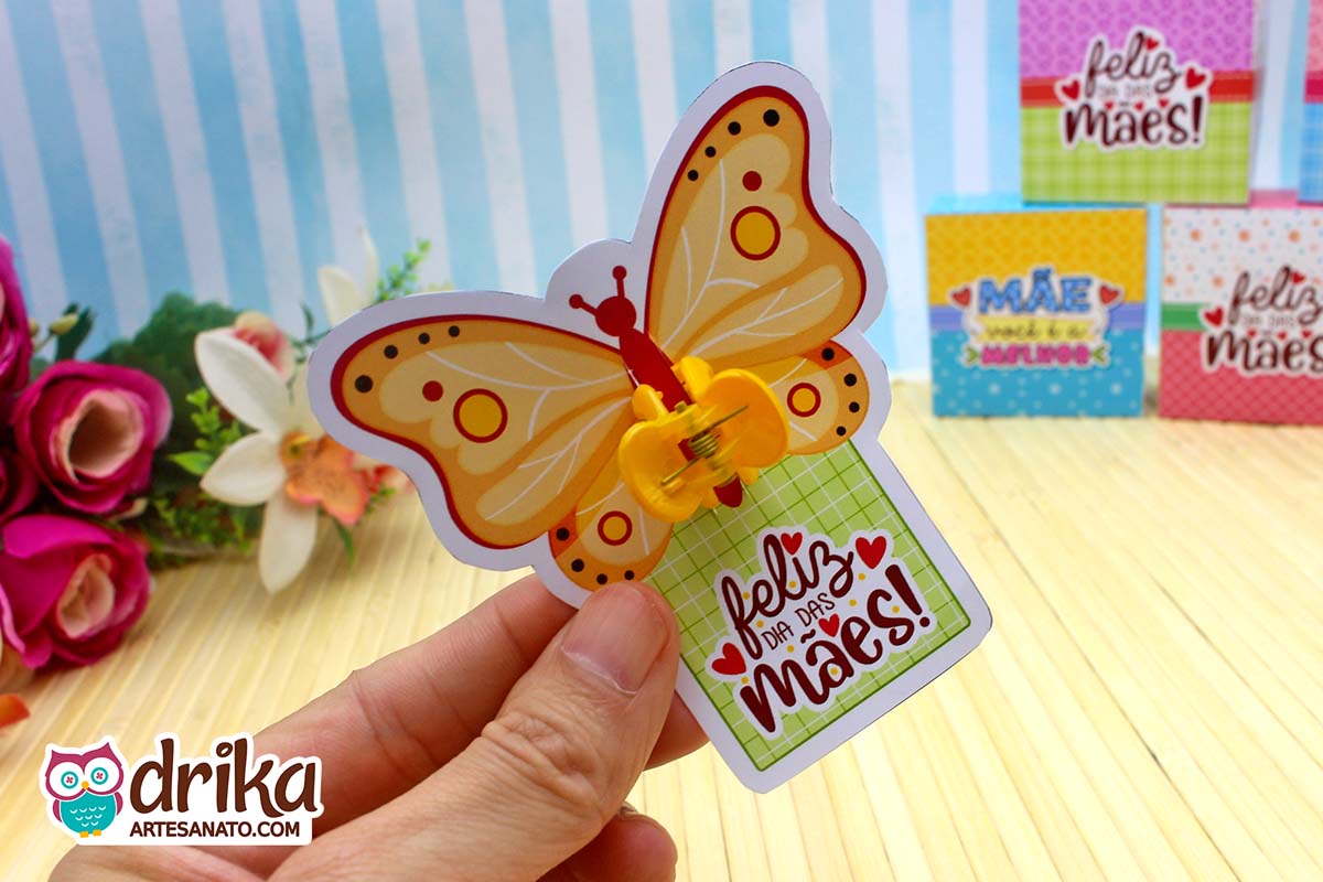 A borboleta delicada ganha vida com detalhes em amarelo e a mini piranha verde fixada ao centro do cartão. Ao fundo, vemos outros modelos coloridos prontos para encantar todas as mamães que os receberem.
