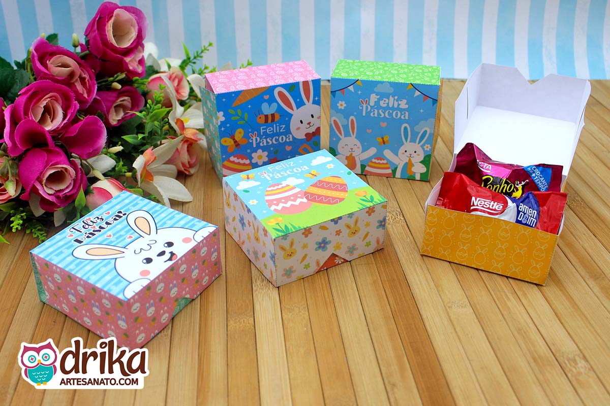 Prepare-se para encantar a todos nesta Páscoa com esta coleção incrível de cinco caixinhas porta bombons!