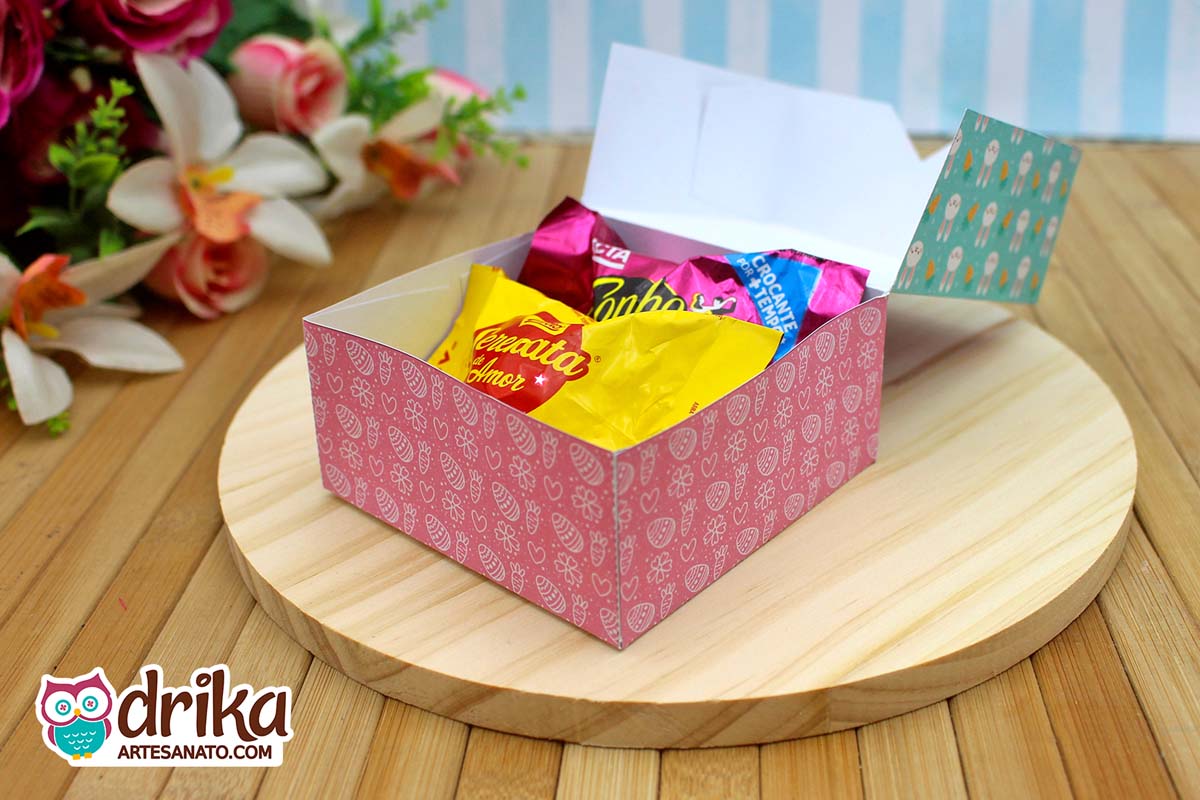 Cada caixinha é perfeita para acomodar 2 bombons como Sonho de Valsa, Ouro Branco ou Serenata de Amor, mas também serve para colocar balinhas, ovinhos pequenos, docinhos ou qualquer outro mimo que você preferir.