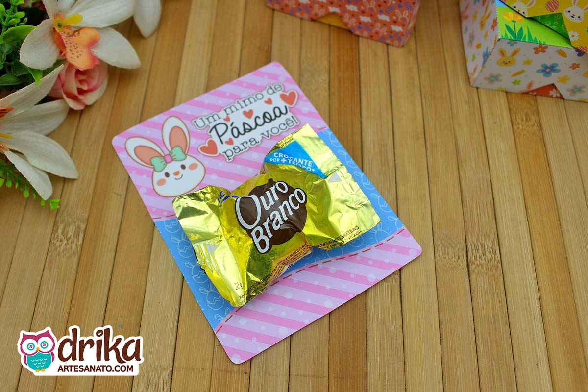Este cartão, como o modelo rosa com a coelhinha e o bombom Ouro Branco, é perfeito para levar carinho aos alunos na Páscoa de forma fácil e encantadora.