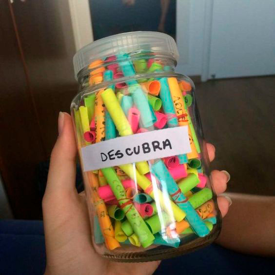 Escolha um pote bem bonito e dentro coloque vários bilhetinhos em papéis de cores diferentes.