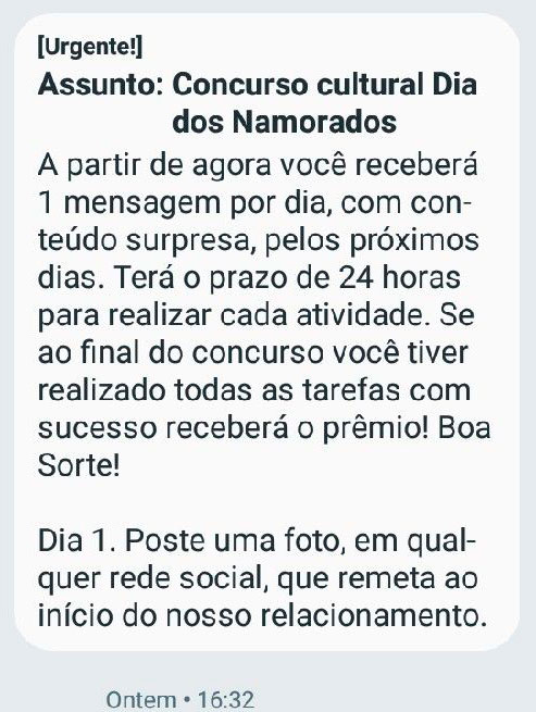 A ideia é enviar mensagens para o namorado todos os dias, durante os 15 dias que antecedem o aniversário dele.