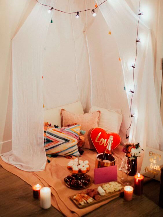 Monte uma tenda na varanda, quintal ou dentro de casa e deixe o clima bem romântico.