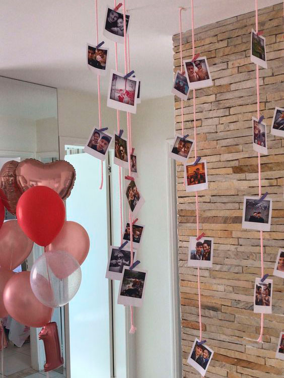 Monte um varal com as fotos que representem os melhores momentos de vocês e finalize a decoração com bexigas!